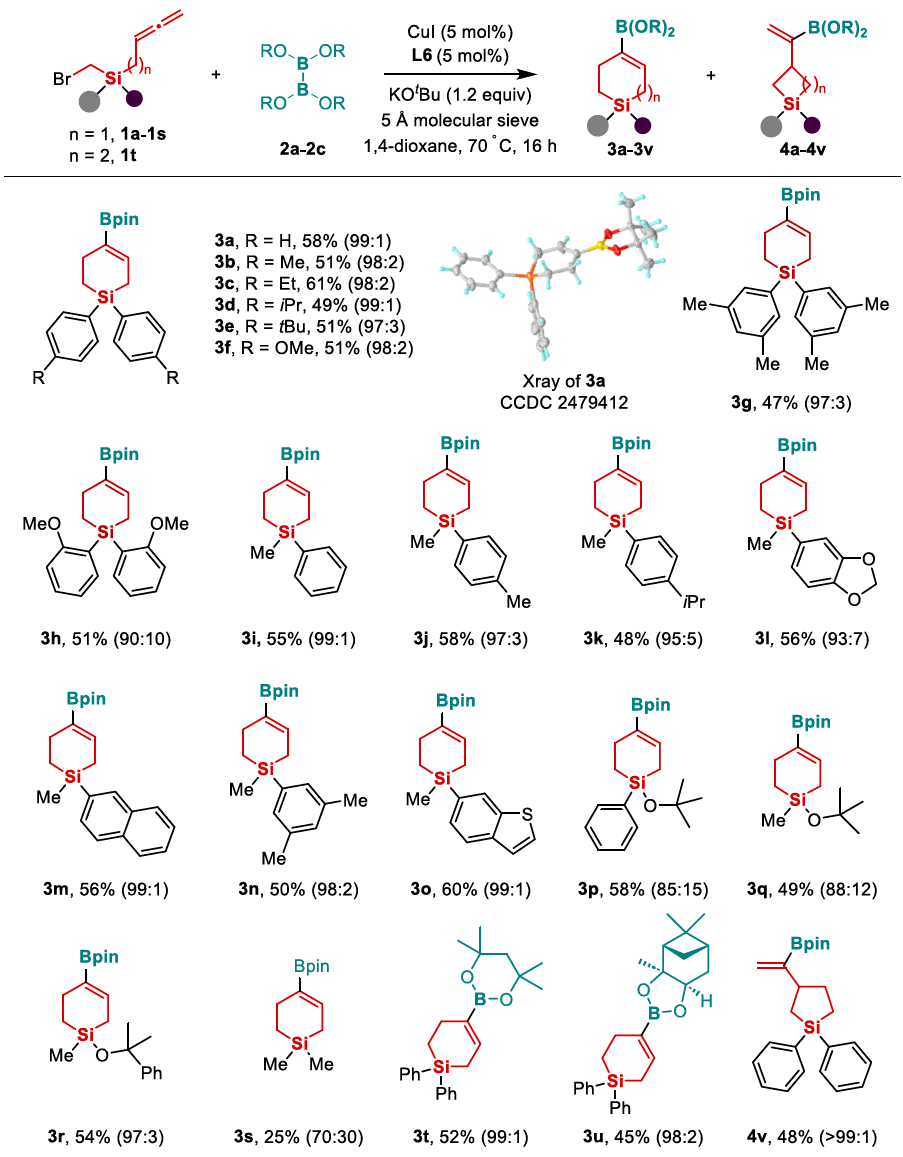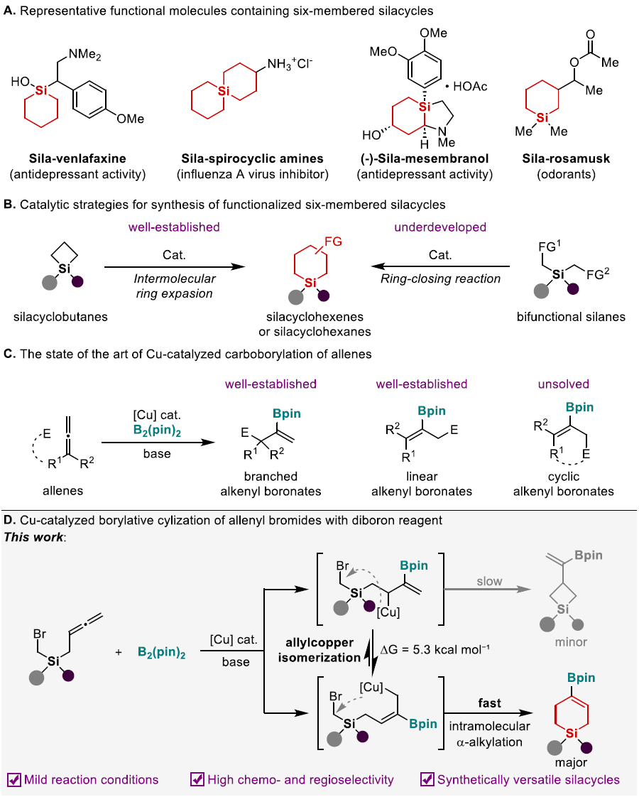 六元硅杂环结构在材料科学与药物研发领域具有重要应用价值。近年来,科研工作者在官能化硅杂六元环化合物的新型合成策略方面进行了持续探索,发展了一系列分子间扩环反应和关环反应的代表性成果。这两类方法能够实现官能化硅环己烯或硅环己烷等六元硅杂环的有效构建,但在官能团多样性拓展方面存在明显短板,只能是反应活性较低的酯基、氨基和烯基等官能团。铜催化联烯与联硼试剂的硼化烷基化反应是制备烯基硼酸酯的高效路径,已被多个课题组验证。该反应通过联烯插入一价铜-硼中间体生成烯基铜活性物种,再与亲电试剂偶联,得到线性或支链型烯基硼酸酯衍生物。尽管该反应已取得显著进展,将其拓展至分子内烷基化以合成环状烯基硼酸酯仍面临挑战。基于对硅杂环官能化及硼官能化有机硅烷的长期研究,研究团队提出设想:以四取代硅桥连联烯基烷基溴为底物,借助分子内硼烷基化环化反应,结合配体与硅连接链的空间位阻及电子效应,精准调控烯丙基铜中间体的环化过程,为高效构建官能化六元硅杂环化合物提供新思路。