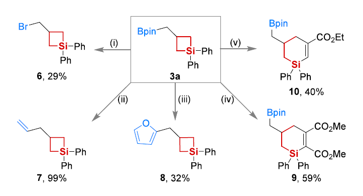 硼甲基取代硅杂环丁烷的合成价值体现在硼基团的丰富转化潜力上。利用转金属化反应,在3,5 - 双(三氟甲基)苯基锂及NBS作用下,其可转化为溴甲基取代产物6;经 Zweifel 烯化反应,能以近乎定量产率(99%)得到烯丙基官能化硅杂环丁烷7;在钯催化剂作用下,可与炔烃发生[4+2]环加成反应,构建多官能化硅环己烯衍生物10和11。这些转化充分彰显了该方法在复杂有机硅分子合成中的应用前景。