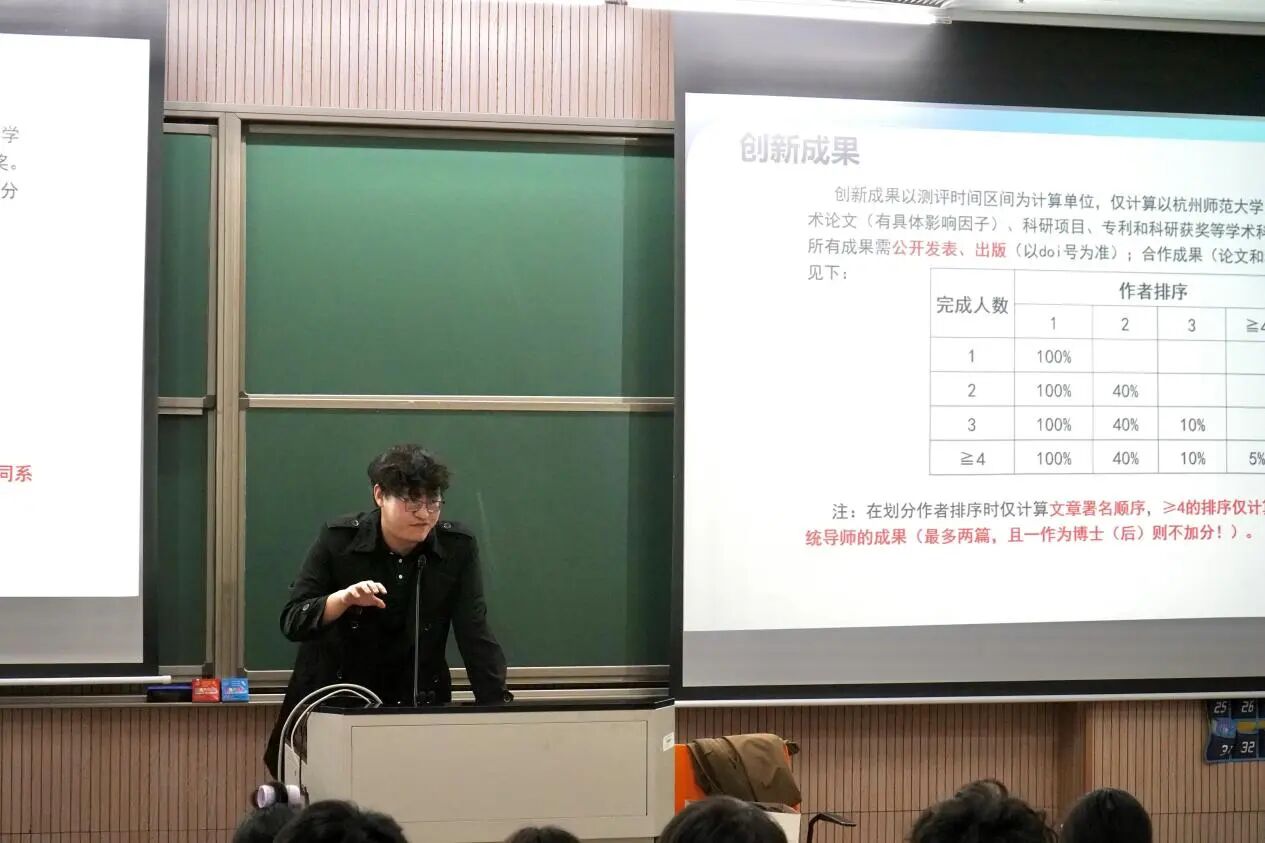 为帮助同学们全面了解学校评价体系,特邀请了学院研究生会主席陈慕寒对综合素质评价实施办法进行了系统解读。从思想道德、学业成绩、科研能力、社会实践等维度详细阐释综测构成,鼓励同学们在专注科研的同时,积极参与各项活动,实现全面发展。