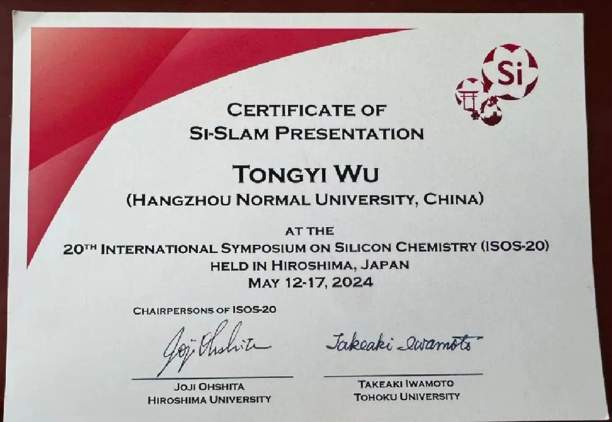 2024年,吴同意踏上了前往日本广岛的旅程,参加 “第二十届国际硅化学论坛会暨第九届亚洲硅论坛会”。这是全球硅化学领域的顶级盛会,云集了学界与工业界的顶尖头脑。吴同意带着他在“3D打印硅基复合材料”上的研究成果,登上了演讲台。一个细节让他至今心潮澎湃——他是该届论坛所有亚洲参会者中,唯一一位参与“Si-Slam”项目的中国学生。“当我开始演讲,身后幻灯片亚洲色吧的国旗标识,让我感受到的不仅是个人荣誉,更是一份沉甸甸的责任。”那一刻,他代表的不仅是自己的研究成果,更是中国青年科研工作者的风貌与水准。他用流畅的论述、严谨的数据,向世界展示了中国青年的学术自信。这份经历,是至高无上的荣光,更是习近平总书记所言“新时代的中国青年是好样的,是堪当大任的!”的最佳注脚。