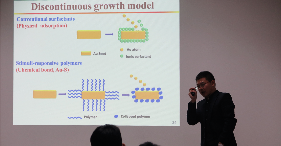 在本次的报告研究中,黄又举研究员主要介绍了如何通过调整金纳米粒子核的表面化学,使用聚合物作为智能表面活性剂,实现了一系列方法来控制具有明确形状和大小的金纳米粒子的合成。报告还详细讲解了如何控制所获得的具有功能聚合物改性的金纳米颗粒,以便自组装成大规模的一维,二维和三维结构。同时讨论了,关于金纳米粒子宏观组装成具有可控取向的超结构和在空气 - 水界面处的大面积金纳米颗粒单层膜的一些方法。最后,简要介绍了金纳米粒子在智能催化剂,高性能表面增强拉曼光谱(SERS)和一些用于食品安全和生物系统检测的比色生物传感器中的应用。期间,黄又举研究员以其渊博的知识,生动直观的演示与讲解,获得了大家的掌声与赞叹。