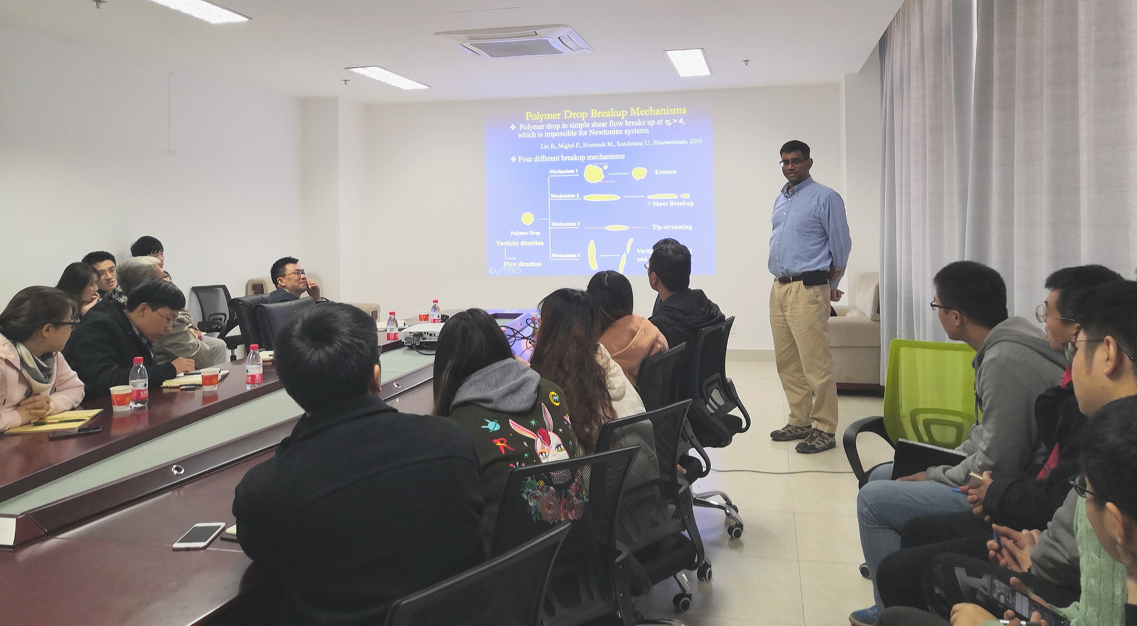 在20日的报告中,Uttandaraman Sundararaj教授向我们讲解了聚合物共混物和纳米复合材料的形貌和性能控制。Uttandaraman Sundararaj阐述了粘弹性体系中的液滴变形和破裂的复杂过程,而微型混合器(APAM和MBM)是聚合物纳米复合材料的高效混合器。同时阐述了NW和CNT含量低的导电纳米复合材料,隔离的网络有助于降低渗透浓度。Uttandaraman Sundararaj教授深入浅出的报告令在座的师生获益匪浅,其严谨深刻的讲述方式更是获得了一致的好评。在座师生认真听讲,积极思考,在报告结束后也教授一起交流自己的困惑。Uttandaraman Sundararaj教授也就相应的问题做了解答,让师生对共混体系的形貌和性能有了更加深刻的认识。