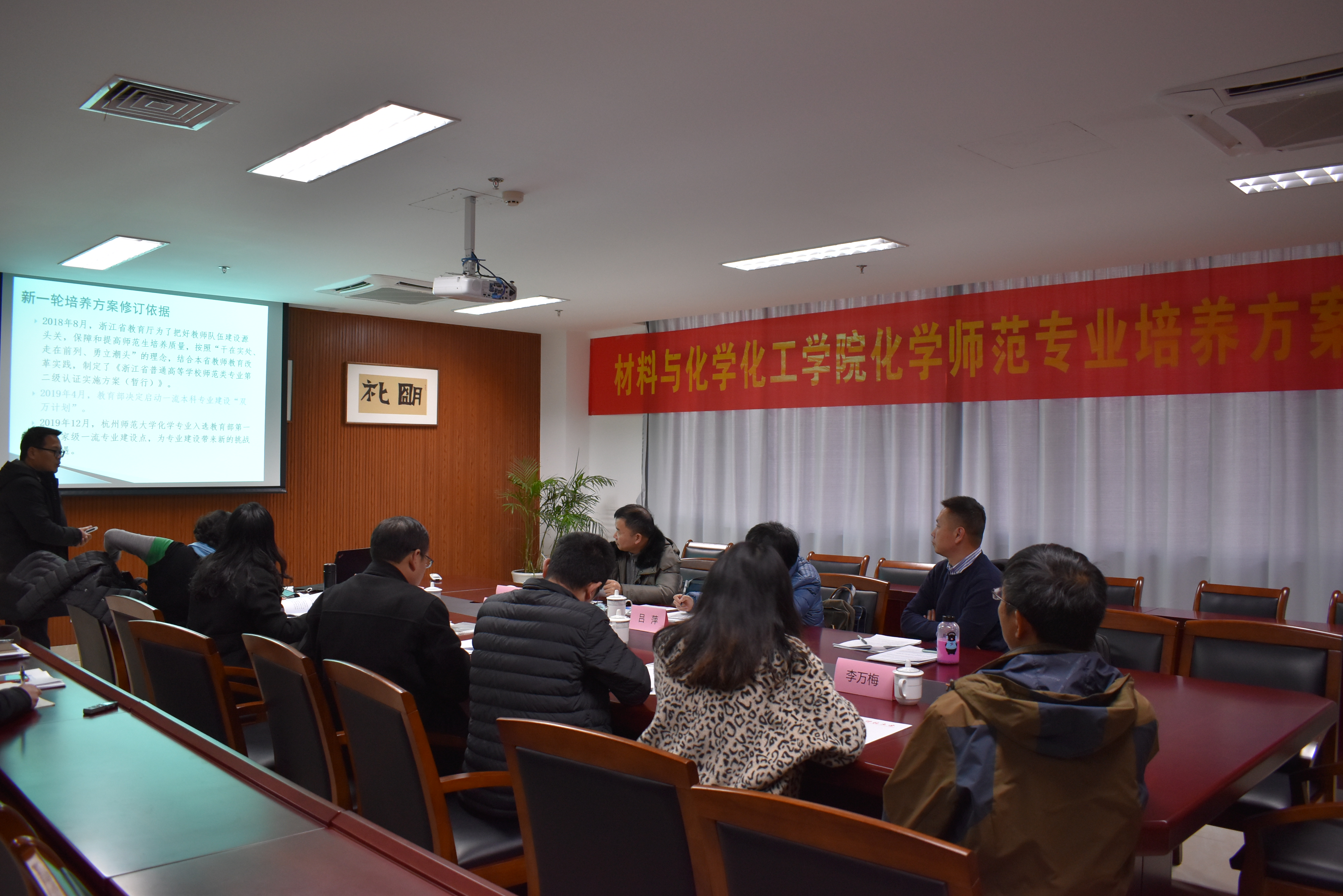 为持续深化教育教学改革,进一步优化各专业人才培养方案,提高人才培养质量,1月12日下午,学院在勤园17号楼二楼会议室召开了“化学(师范)专业培养方案论证会”,对学院2021版化学(师范)专业培养方案进行整体把握与修订。论证会邀请了中国化学会化学教育委员会委员、浙江大学吕萍教授、浙师大化学与生命科学学院副院长乔儒教授、浙江省教育厅教研员、特级教师任雪明作为论证专家,为学院人才培养方案的制定和修订提出建设性指导意见。副院长曾晓飞主持了会议,材化学院院长、化学(师范)专业负责人章鹏飞,系主任王民,系副主任、无机教研室主任王秀丽,系副主任、有机教研室主任李万梅,分析教研室主任邱瑾,物化教研室主任胡自强等老师参加了此次会议。