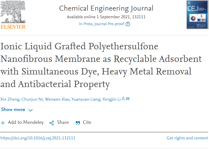 材化学院李勇进教授团队长期从事高分子材料辐射接枝改性及功能材料制备研究。近日,团队利用辐射引发接枝聚合的方法,成功将含有双键的多功能阳离子型离子液体,1-乙烯基-3-丁基咪唑四氟硼酸盐(IL,VBIm BF4),原位接枝在聚醚砜(PES)分子链上(PES-g-IL),获得了具有优异亲水性的PES膜材料,并进一步通过静电纺丝制备了具有高孔隙率和高比表面积的PES-g-IL纳米纤维膜。PES-g-IL纳米纤维膜上的阳离子可以通过静电相互作用吸附带负电的染料分子,同时,离子液体咪唑环上带孤对电子的N原子还可以通过金属螯合作用捕捉重金属离子,实现了染料和重金属的同时吸附。此外,PES-g-IL纳米纤维膜上的离子液体还可以吸附细菌并破坏其细胞膜完整性而导致细菌死亡。这种多功能的吸附材料还可以多次重复使用。相关研究成果以“Ionic Liquid Grafted Polyethersulfone Nanofibrous Membrane as Recyclable Adsorbent with Simultaneous Dye, Heavy Metal Removal and Antibacterial Property”为题发表在Chemical Engineering Journal(IF=13.273)上。
