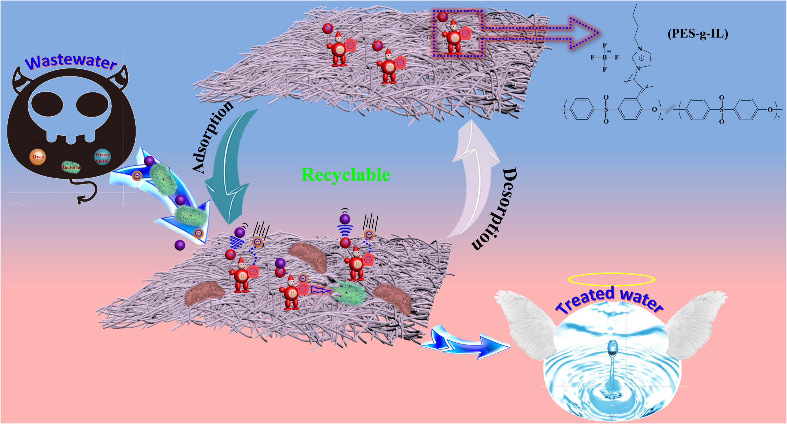 PES-g-IL分子结构示意图及其纳米纤维膜在复杂污水处理中的应用