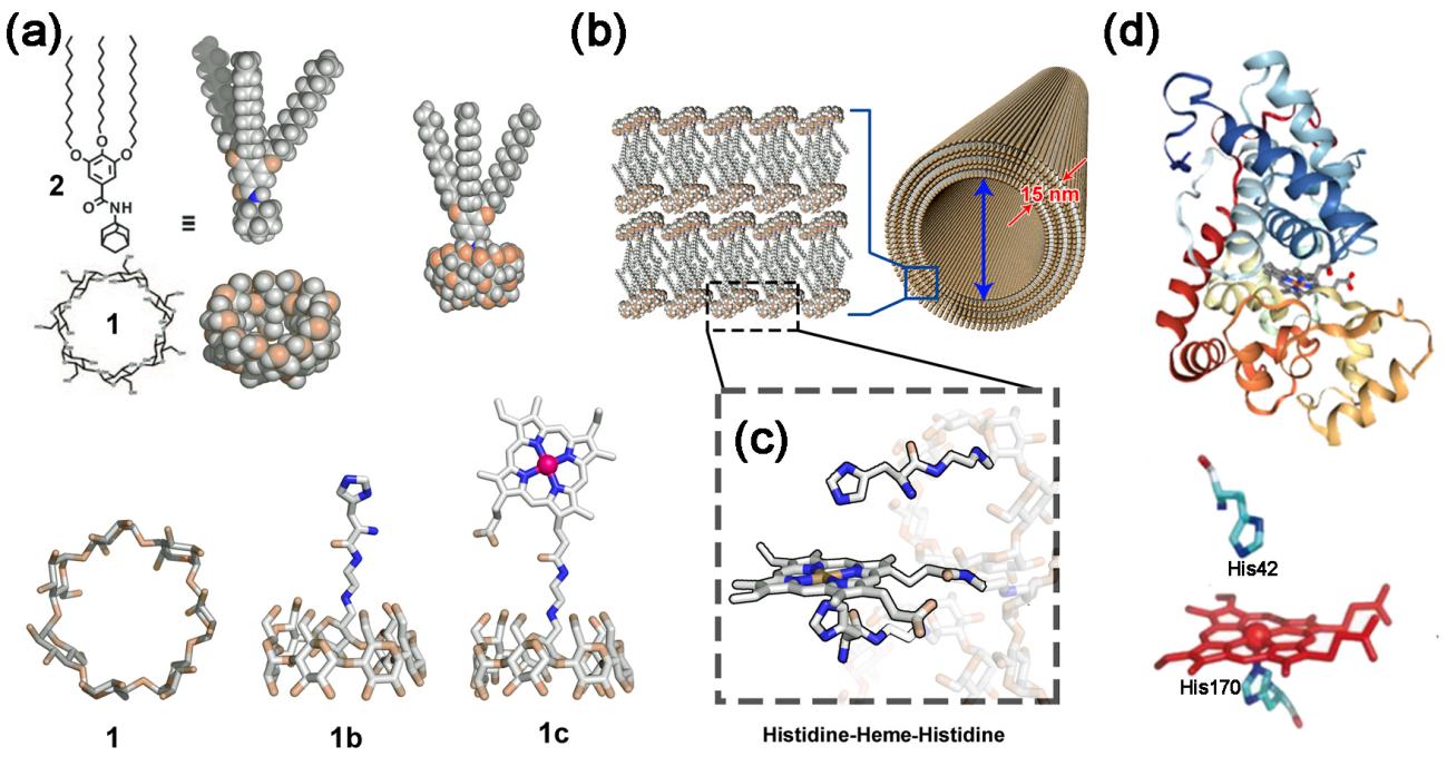 受到天然HRP结构的启发,在此, 亚洲色吧 材料化学与化工学院的刘俊秋团队提出了将天然HRP活性位点(组氨酸-血红素-组氨酸)负载到一个巨大的超分子纳米管来构建类过氧化物纳米酶的新策略(图1)。如图1a,b,c所示,具有HRP活性位点的超分子主体分子血红素-β-环糊精(Heme-CD)和组氨酸-β-环糊精(His-CD)首先与超分子客体分子金刚烷醇-1-3,4,5-三(十二氧基)苯并酰胺(Ad-TDB)通过主客体相互作用形成超分子双亲物,超分子双亲物随后在水中自组装形成超分子纳米管。这种具有组氨酸-血红素-组氨酸三元复合体的超分子管状纳米酶被赋予了类似于天然HRP的催化微环境。首先,一个组氨酸与血红素配位,具有稳定血红素和防止血红素自我聚集的作用,增强了血红素的催化活性。其次,另一个组氨酸位于血红素附近,作为H2O2的识别位点,通过形成氢键桥提高H2O2对血红素的亲和力,从而进一步提高纳米酶的活性。