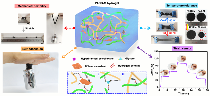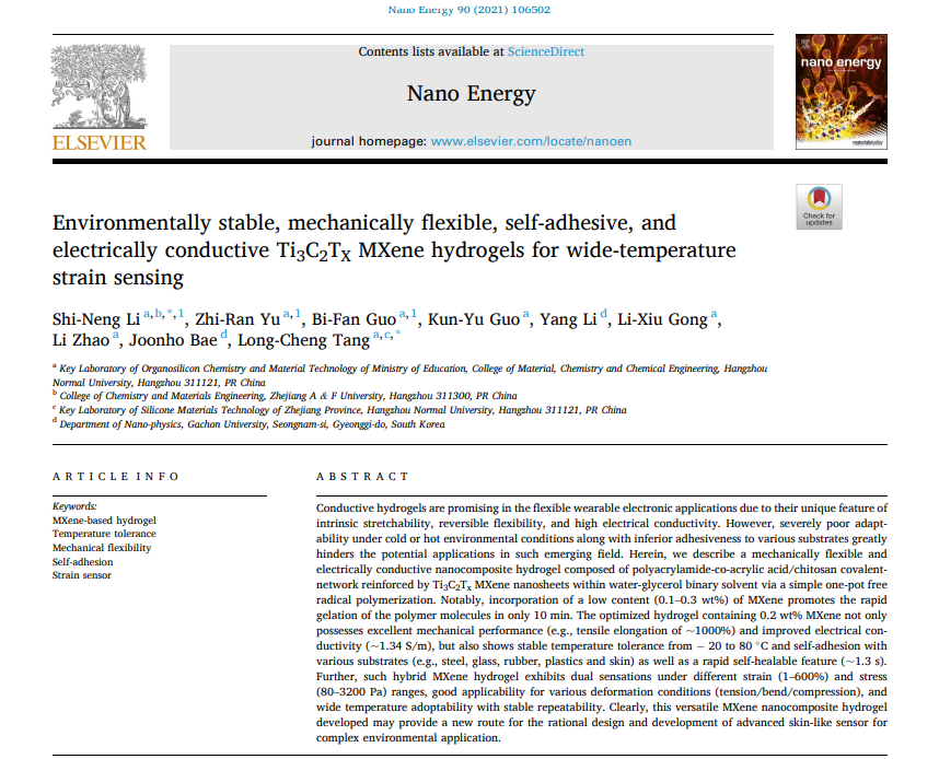 近日,亚洲色吧 汤龙程研究员团队及其合作者浙江农林大学厉世能博士在国际知名期刊Nano Energy上发表题为“Environmentally stable, mechanically flexible, self-adhesive, and electrically conductive Ti3C2Tx MXene hydrogels for wide-temperature strain sensing”的文章(2021, 90, 106502;IF=17.881)。