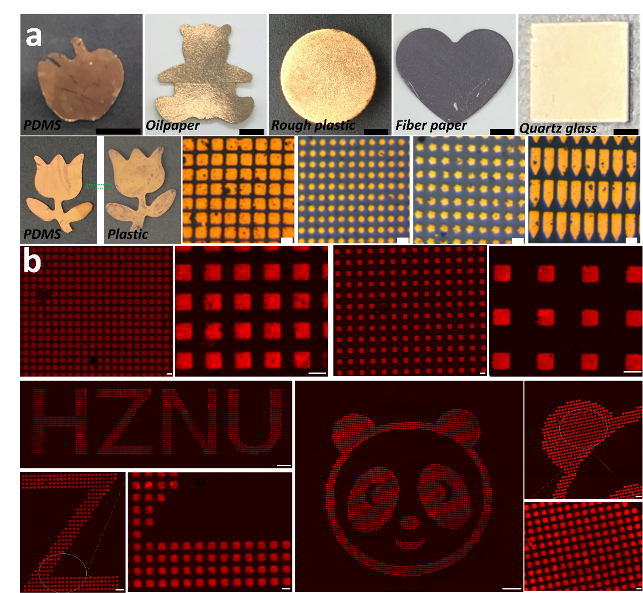 图2. 基于纳米粒子界面自组装的薄膜工程技术:(a)宏观及微观图案的保形打印技术;(b)功能化高分辨荧光微图案的制备。