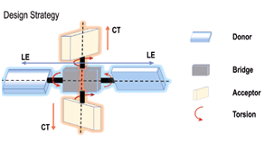 有机电致发光器件(OLED)具有轻薄、低功耗、高对比度、自发光以及可柔性等优势,在显示与照明应用领域中大放光彩。近紫外有机发光二极管(NUV-OLED)在化学和生物传感器、光激发源、固态显示器和高密度信息存储设备等领域的广泛应用前景使之成为热点前沿领域。从材料设计角度,开发兼具高固态发光效率和高激子利用率的有机发光材料,是构筑高性能OLED的关键。但根据自旋统计规则有机电致发光器件中载流子复合仅会以25%概率形成可以辐射发光的单线态,而75%的三线态激子会被浪费。具有杂化局域电荷转移态(HLCT)的分子能够利用高能级三线态激子反向系间窜越生成单线态激子,理论上可现实100%的激子利用。但HLCT分子中电荷转移态常使光谱红移,因此如何平衡发光波长和高激子利用率是近紫外发光材料设计的难点。