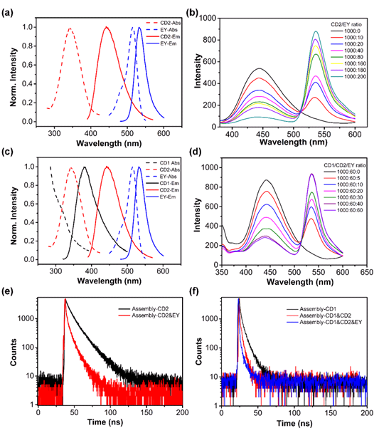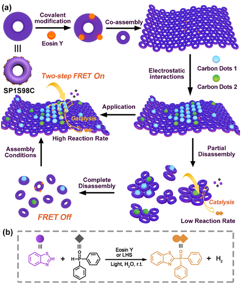 为了解决这一问题, 亚洲色吧 刘俊秋教授团队构筑了一种基于可控蛋白质自组装结构的多级智能人工光捕获系统(图1)。具体如下:(1)以环状的热稳定蛋白SP1为基元设计了SP1S98C突变体,通过动态共价自组装策略构筑了具有氧化还原响应的二维SP1蛋白质纳米片层;(2)以低毒、环境友好的碳量子点(CDs)为荧光生色团,并通过静电相互作用在SP1纳米片层为支架精确展示,实现不同量子点(CD1和CD2)之间的传递;(3)将具有光催化活性的EY中心共价锚定在蛋白质片层表面,研究其能量接收及光催化性能。光照后,实现能量从供体(CD1)到第一受体(CD2)再到第二受体(EY)的逐级顺次传递(图2)。因此,研究团队发展出具有多步顺序荧光共振能量转移(FRET)过程的可控人工光捕获系统,进而实现对光催化模型反应的可控调节,同时从结构、能量传递方式和催化能量转化三个方面同时模拟了天然光捕获系统。