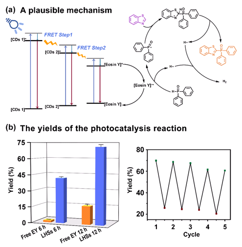 作为该体系第二受体的EY分子,在许多有机催化反应中都表现出了卓越的光催化性能。这使其在充当能量传递第二受体的同时,也具有极大潜能成为一个良好的反应催化活性中心。在所构筑的能量逐级人工光捕获系统中,EY作为光催化剂,可以催化苯并噻唑与二苯基磷氧的光催化耦联产氢的模型反应,但是,由于其吸收谱带较窄,致使光谱可利用范围很小。利用该的人工光捕获系统来对该反应进行催化,CD1和CD2捕获到的光能最终传递到第二受体兼反应中心EY,拓宽了光谱利用范围,在原始催化剂游离EY的17%产物产率基础上,将产物产率提高至71%,大大提高了催化性能(图3)。此外,由于驱动蛋白质纳米骨架形成的二硫键具有刺激响应特性,该光捕获系统也具有动态可调控的性能,这种刺激响应性质不仅可以控制FRET发生的程度,进而还可以调控催化反应的进程。该研究结果对于理解和模拟天然光捕获系统工作机制具有较好的生物学意义,也为天然光合系统对环境刺激响应性的研究提供了灵感。