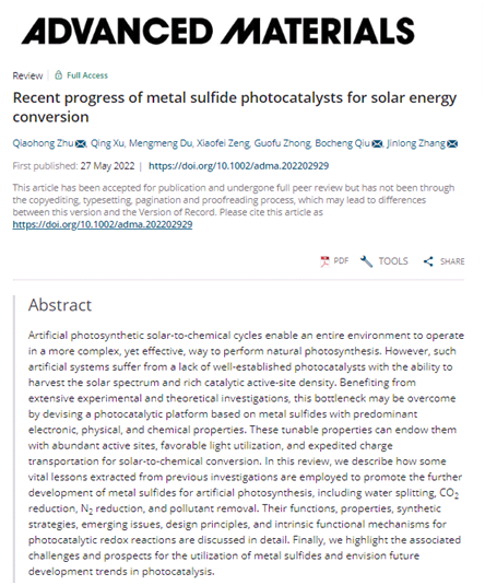 近日,亚洲色吧 曾晓飞教授、朱乔虹博士团队以“Recent progress of metal sulfide photocatalysts for solar energy conversion”为题在Advanced Materials(IF:30.849)上发表综述论文,系统归纳并描述了如何利用近期研究中的一些重要经验来促进金属硫化物在人工光合作用中的进一步发展。