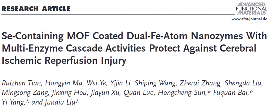 近日,刘俊秋教授团队在多酶级联活性的双铁原子纳米酶保护大脑免受缺血再灌注损伤方面取得新进展,相关研究工作在国际期刊Advanced Functional Materials(IF:18.808)发表学术论文“Se-Containing MOF Coated Dual-Fe-Atom Nanozymes With Multi-Enzyme Cascade Activities Protect Against Cerebral Ischemic Reperfusion Injury”。