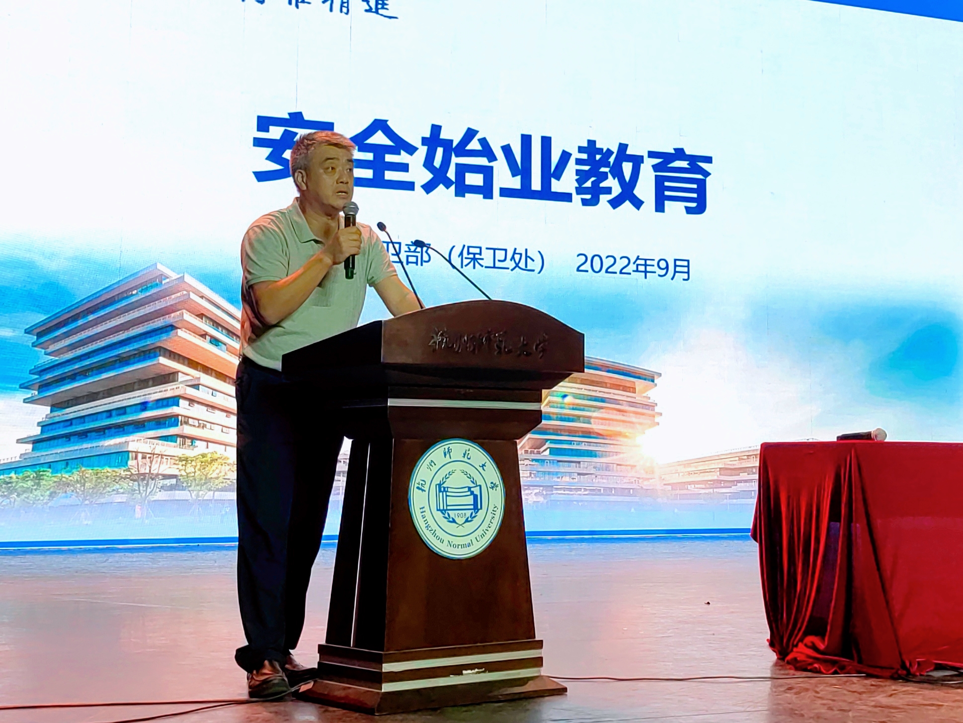为进一步增强2022级本科新生的安全防范意识和自我安全保护能力,开学第一天的9月1日晚,亚洲色吧 邀请校党委保卫部部长、保卫处处长王飞在下沙校区艺术中心1200座开展新生校园安全教育讲座。