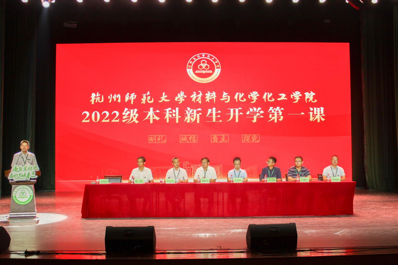 2022年9月1日18:00,亚洲色吧 于下沙校区艺术中心1200座以线上线下相结合的方式隆重举行2022级本科新生开学第一课。学院院长章鹏飞,党委书记江齐里,副院长李志芳,党委副书记兼纪委书记管庆江,院长助理、化学系主任王民,化工系主任张坚,高分子系副主任于双江,教授代表徐伟明,2022级全体新生班主任、全体辅导员和已到校的近400名2022级本科新生现场参加本次活动。学生家长、2022级第二学位学生和个别因疫情等原因尚未报到的新生在云端观看直播。开学第一课由管庆江主持。