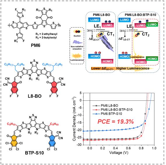 电荷转移(CT)状态不仅影响体系的能量损失(Eloss),而且影响光生载流子的产生效率。缩小CT状态(ECT)能级和最低激发态(ELE)能级之间的偏移(ΔELE-CT)可以降低激子猝灭回基态的概率,这有助于降低能损,实现更高Voc。然而,驱动力(能级之间的偏移,ΔELE-CT)的减弱对高Jsc的激子解离不利,反之亦然。同时,给体-受体(D-A)界面CT态的性质受活性层形貌的影响,而三元OPV(TOPV)被证明是一种有效的能级调控和形貌优化方法。为了设计高效的TOPV,我们一方面采取选取具有高发光效率的第三个组分来提升TOPV中的ECT,通过缓解的非辐射复合过程来获得更低的Eloss;另一方面将第三组分位于主D-A界面,通过产生的额外电荷传输通道来帮助激子解离,从而弥补提升CT态所带来的驱动力不足,使高Jsc,最终实现效率的突破。