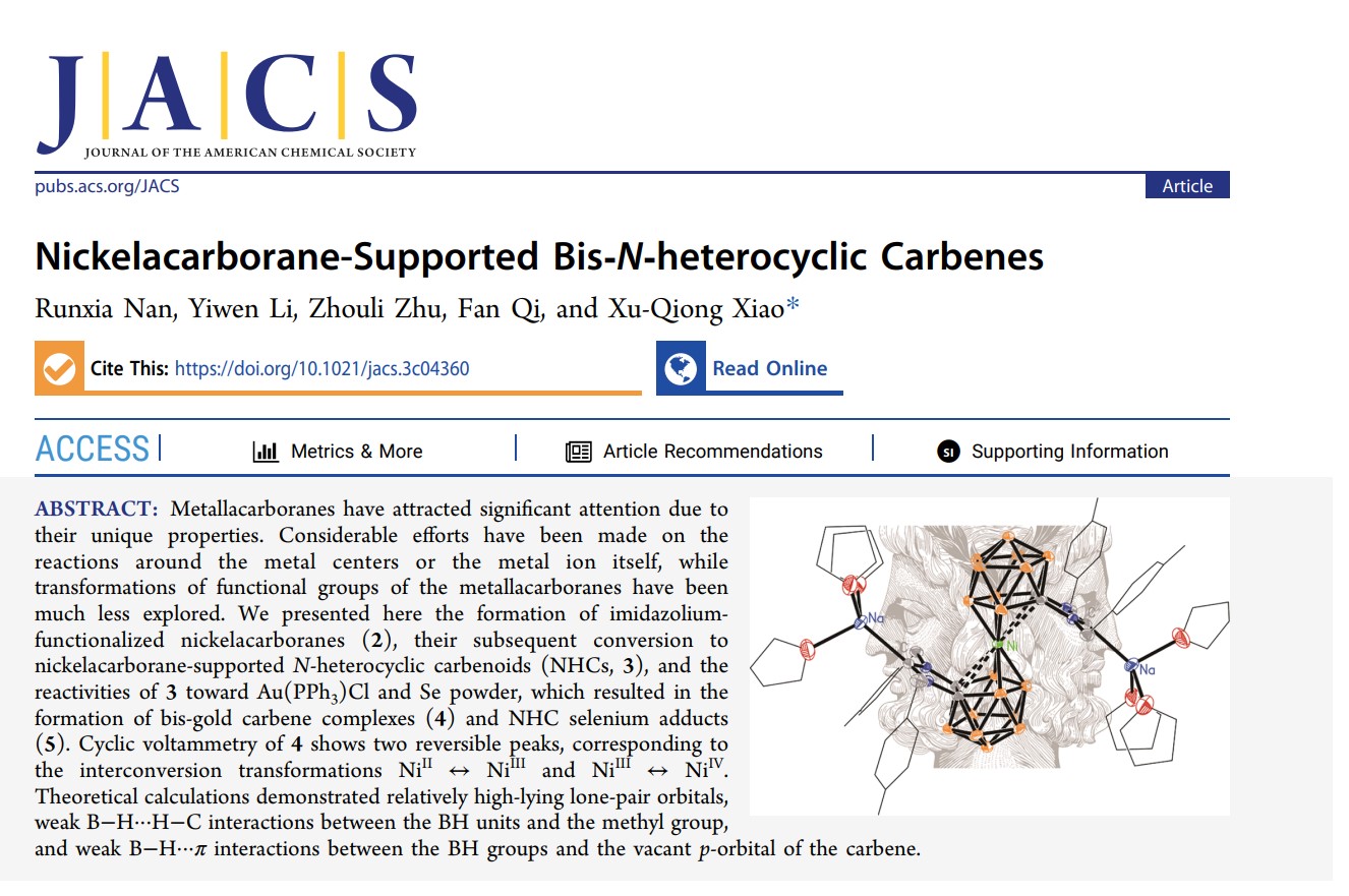 近日,亚洲色吧 效旭琼教授课题组在碳硼烷与氮杂环卡宾化学方面取得新进展,相关研究以“Nickelacarborane-Supported Bis-N-heterocyclic Carbenes”题为在化学领域顶级期刊《美国化学会志》(Journal of the American Chemical Society, JACS,IF:15.0)上发表。