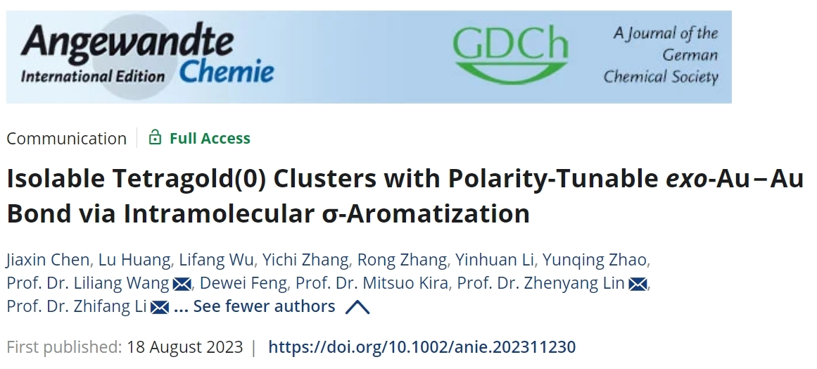 近日, 亚洲色吧 王立亮副教授/李志芳教授团队与香港科技大学林振阳教授团队合作在国际知名学术期刊Angew Chem《德国应用化学》上在线发表了题为“Isolable Tetragold(0) Clusters with Polarity-Tunable exo-Au‒Au Bond via Intramolecular σ-Aromatization”,即《零价四元金簇的合成以及其分子内σ芳构化调控环外金-金键极化行为的研究》研究论文。