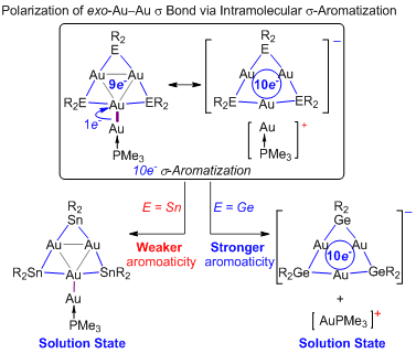 同时他们也进行了理论计算来揭示该化合物所具有的新型稳定模式——分子内σ-芳构化;电子结构分析表明,这些低对称性的金属簇拥有一个十电子的σ-芳香系统,该系统通过分子内σ-芳构化实现。此外,正如同分子内π芳构化一样,分子内σ-芳构化导致了高极性的环外Au‒Au键极化,其极化强度甚至可以导致2a在溶液中的离子化。这与其锡的类似物2b表现出极大的差异,原因是这一环外Au‒Au键的极性强弱可以通过分子内σ-芳构化的程度强弱调节(图二所示);这一现象同时也在核磁共振(NMR)表征实验中被证实。