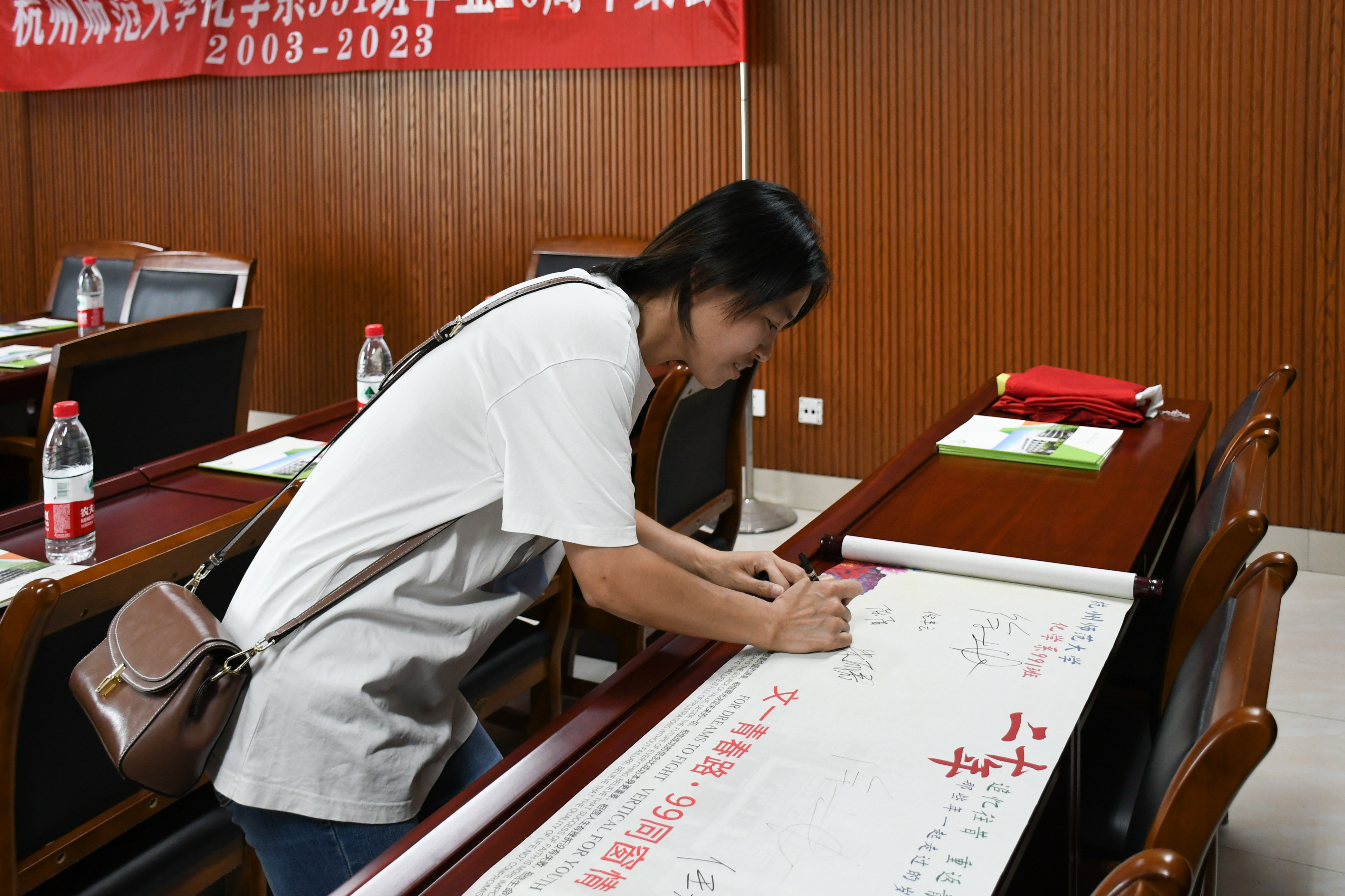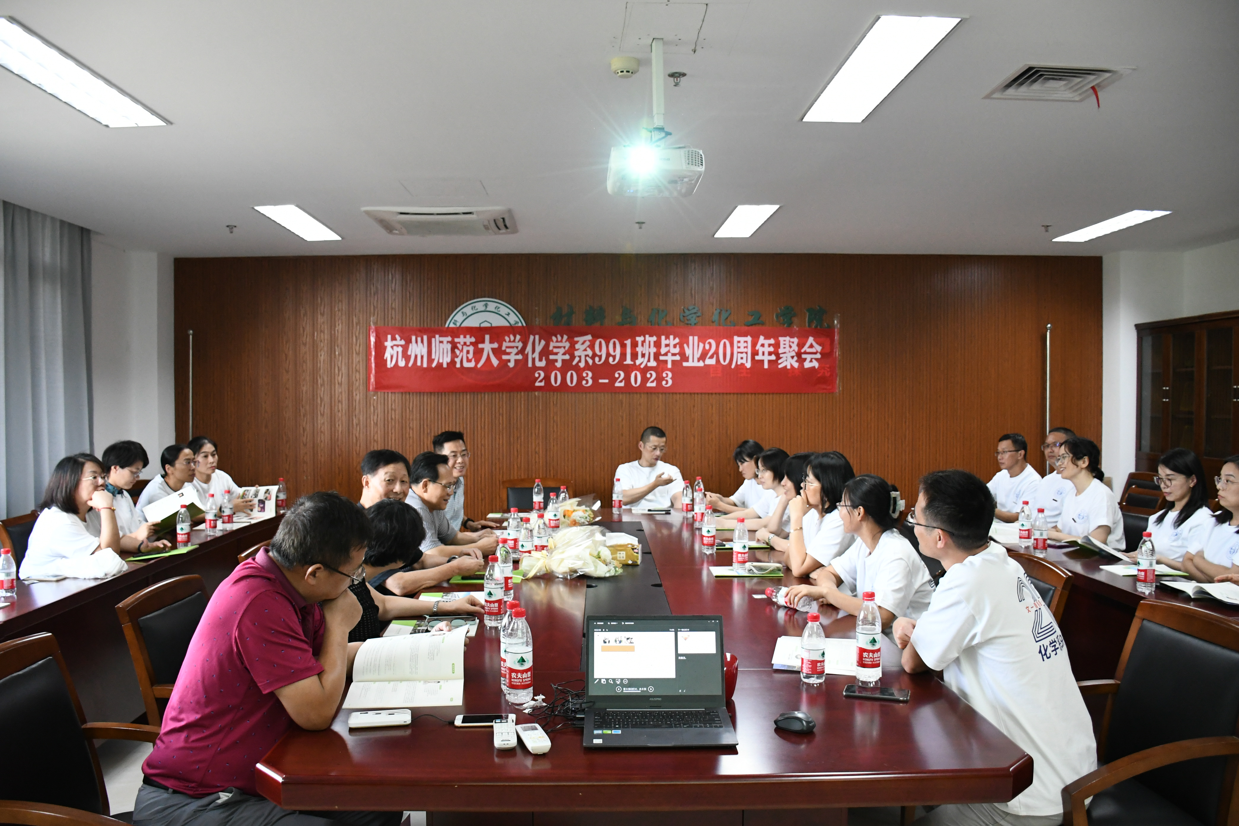 金秋飒爽,丹桂飘香,喜逢国庆。10月1日下午,亚洲色吧 化学991班二十余位校友欢聚仓前校区,举办“青春路 同窗情”毕业二十周年同学会。校友们重回母校、重聚材化,跨越时间长河,再叙师生情谊,同谋母校发展,重温师大岁月。时任化学系主任盛国定、化学991班班主任徐土根,时任年级辅导员、阿里巴巴商学院党委书记何军,任课教师代表邱瑾、刘金华,学工办主任兼学院校友工作联络员韩秉峻等热情接待了校友们。活动由化学991班校友、杭州市萧山区第二高级中学副校长任瀚旻主持。