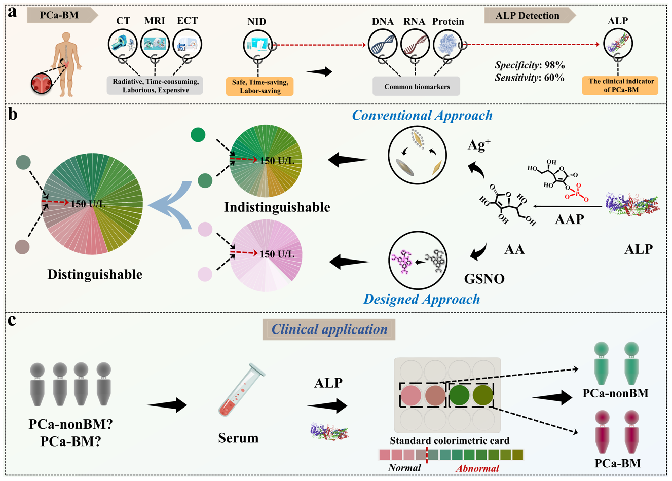 既往研究表明,碱性磷酸酶(ALP)是临床中广泛使用的监测PCa-BM的指标,其作为PCa-BM的生物标志物具有出色的特异性(98%)和敏感性(60%)。骨转移的发生导致大量成骨细胞增殖,引起ALP水平升高。当骨转移发生时,会增加血清中的ALP表达水平。将ALP的异常升高变化与正常水平(40-150 U/L)相比,可用来监测骨转移的发生和发展。然而,目前大多数方法在150 U/L左右的颜色识别直观程度较低,无法在PCa-BM早期诊断中实现关键的颜色区分以判别ALP的异常表达。因此,值得进一步开发更简便、高分辨率的视觉信息处理技术,用于肉眼检测识别异常的ALP浓度,并实现骨转移早期诊断。