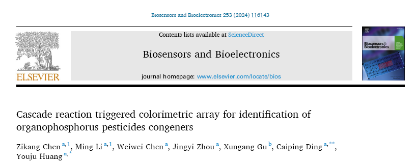 近日,亚洲色吧 黄又举教授团队在双酶诱导多色可视化传感器用于灵敏识别多种有机磷农药方面取得新进展。相关研究结果以“Cascade Reaction Triggered Colorimetric Array for Identification of Organophosphorus Pesticides Congeners”为题发表在Biosensors and Bioelectronics (Q1, IF=12.545)。DOI:10.1016/j.bios.2024.116143。