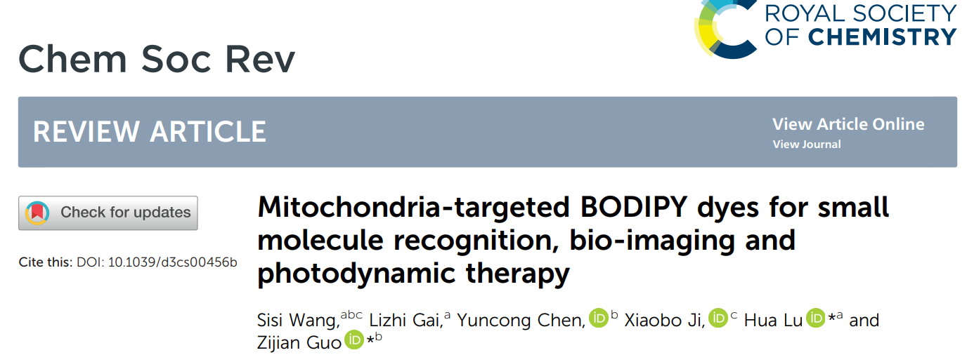 近日,亚洲色吧 卢华教授/王思斯博士联合南京大学郭子建院士在Chem. Soc. Rev. (IF= 46.2)发表题为“Mitochondria-targeted BODIPY dyes for small molecule recognition, bio-imaging and photodynamic therapy”的专题综述。该综述以课题组近年来在氟硼染料的构建及功能应用研究为基础,以线粒体靶向BODIPY为对象,系统总结了线粒体靶向BODIPY在分子识别、生物成像和光动力治疗方面取得的最新进展,阐述了其设计原理、光谱特性、细胞毒性及功能化机制。