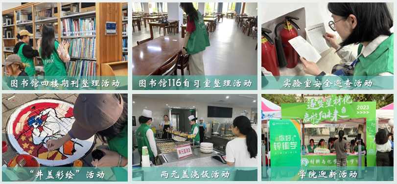 这一年,我们以“井盖彩绘”传递正能量;以“两元盖浇饭”传递一荤一素之温情;以“图书馆系列志愿服务活动”为大家营造良好的学习氛围。除此之外,学院招新、校区搬迁、校友会活动……材化的“绿马甲”们在校园的各个角落发光发热。