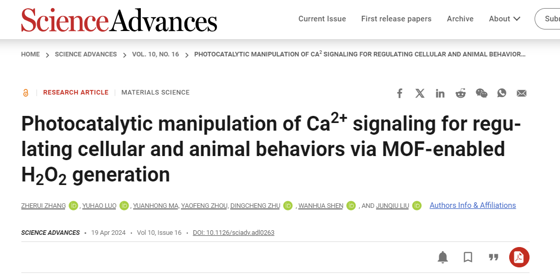 近日,杭师大材化学院刘俊秋教授团队/生环学院沈万华教授团队携手合作,在生物Ca2+信号激活的交叉研究领域取得突破性进展,相关研究成果以题为“Photocatalytic manipulation of Ca2+ signaling for regulating cellular and animal behaviors via MOF-enabled H2O2 generation”发表于Science子刊Science Advances(IF = 13.6)。