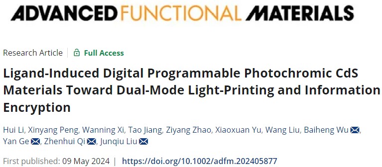 近日,亚洲色吧 刘俊秋教授团队在光致变色材料领域取得新进展,相关研究成果以题为“Ligand-Induced Digital Programmable Photochromic CdS Materials Toward Dual-Mode Light-Printing and Information Encryption”发表于国际知名期刊Advanced Functional Materials(IF=19.0)上。