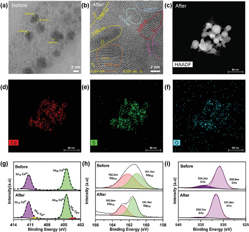 实验结果表明,CdS QDs在紫外光照射下会发生从黄色到黑色的颜色转变,并且伴随着光致荧光发射的红移。这一现象归因于光激发引起的电子-空穴对的生成,以及随后的表面配体解吸和QDs的聚集。研究人员通过TEM,FTIR,XPS等表征技术,初步揭示了CdS QDs在紫外光照射过程中的发生的一系列微观结构变化和化学组成变化: