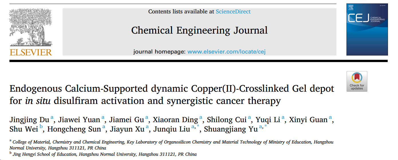近日,亚洲色吧 刘俊秋教授团队在载药水凝胶用于肿瘤局部联合治疗方面取得新进展。相关研究结果以“Endogenous Calcium-Supported dynamic Copper(II)-Crosslinked Gel depot for in situ disulfiram activation and synergistic cancer therapy”为题发表在Chemical Engineering Journal (IF: 15.1)。