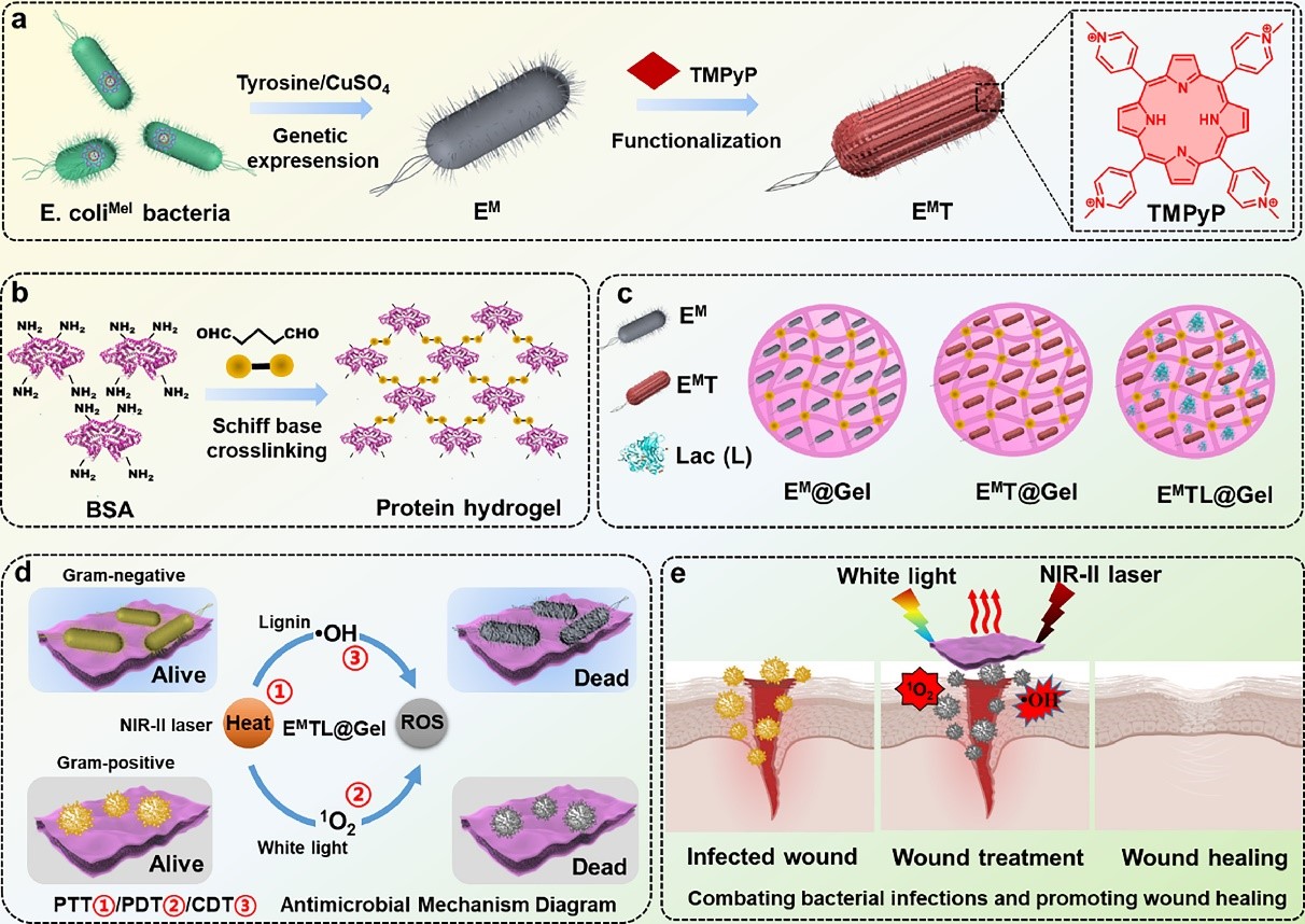 为了促进细菌感染的治疗效果并在时空上限制工程细菌的感染,亚洲色吧 刘俊秋教授团队提出“以菌抗菌”的概念,将工程光热细菌与蛋白质水凝胶平台相结合,开发了一种生物相容性、多模式、工程活蛋白质水凝胶贴片,用于结合活性氧(ROS)和细菌的光热疗法(图1)。首先构建了一种黑色素基因工程大肠杆菌(EM)并用于体内表达黑色素颗粒,表现出良好的光热响应。带正电荷的四甲基吡啶卟啉(TMPyP)被吸附在EM(EMT)表面,通过避免聚集和提高PDT抗菌剂的量子产率,促进光介导产生剧毒单线态氧(1O2)。漆酶(Lac)是一种含铜多酚氧化酶,被引入以在木质素存在的有氧条件下催化有毒ROS的产生。最后,通过戊二醛交联,将工程化的 EMT 生物杂化物和 Lac 酶 (EMTL@Gel) 共同嵌入生物相容性牛血清白蛋白 (BSA) 水凝胶贴片中。
