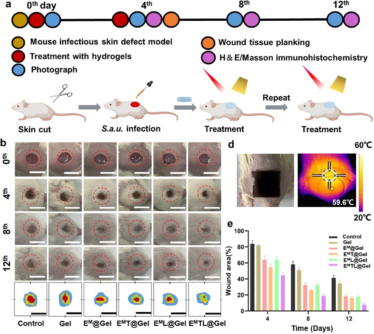 动物实验研究表明,EMTL@Gel贴片不仅减少了工程EM细菌的扩散,而且在光照射和木质素剂存在下通过光热、光动力和催化联合治疗对革兰氏阴性菌和革兰氏阳性菌具有协同抗菌作用。工程活体贴片还对小鼠细菌感染的皮肤伤口表现出伤口愈合作用。伤口面积和感染是最直观的评价指标,用于评估不同组样本的修复效果(图2)。在愈合过程的第 4、8 和 12 天定量测量了小鼠的伤口面积,实验组的伤口愈合比率最高,表现出极佳的治疗效果。