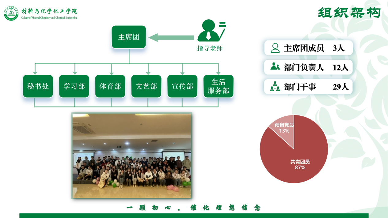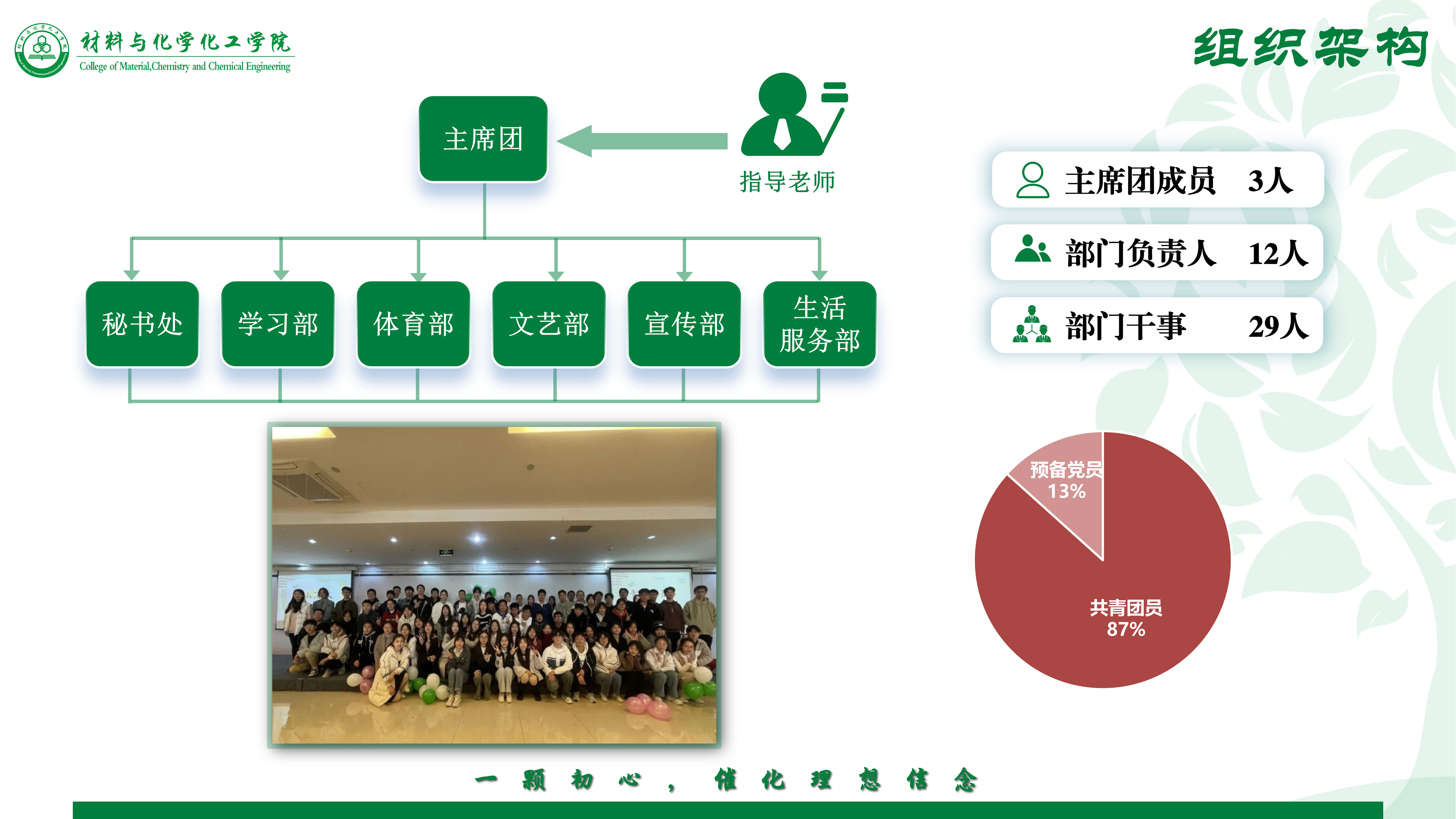 在指导老师的带领下,亚洲色吧 学生会形成“1+6(主席团+六个部门)”的组织构架,“1”为主席团,“6”分别为秘、学、体、文、宣、生六个部门。共有主席团3人,部门负责人12人,部门干事29人;除预备干事外,预备党员占比13%,其余全为共青团员。