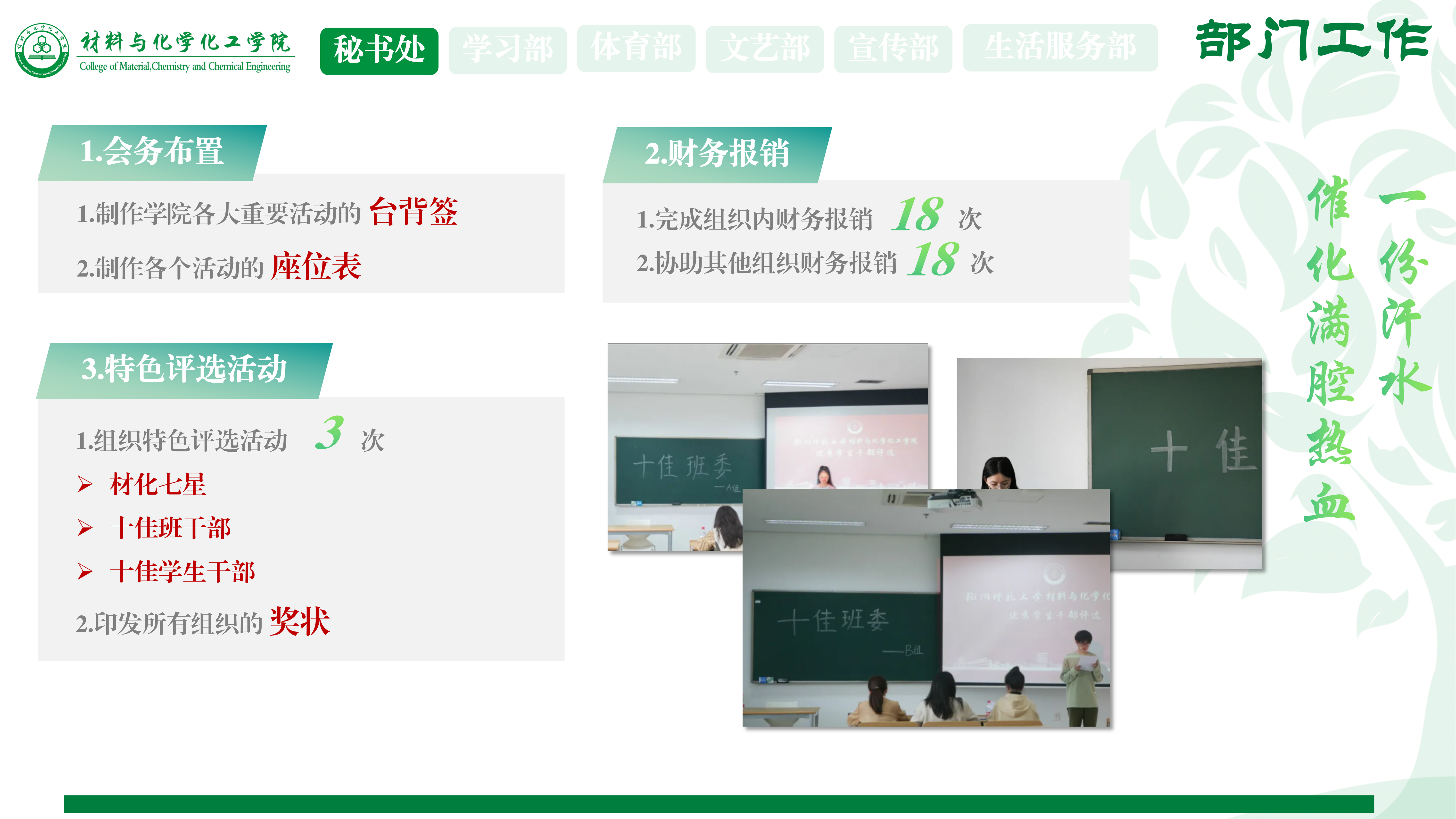 不仅是老师的助手,更是协助各组织的得力干将,分工明确,负责会务布置、财务报销、特色评选活动。