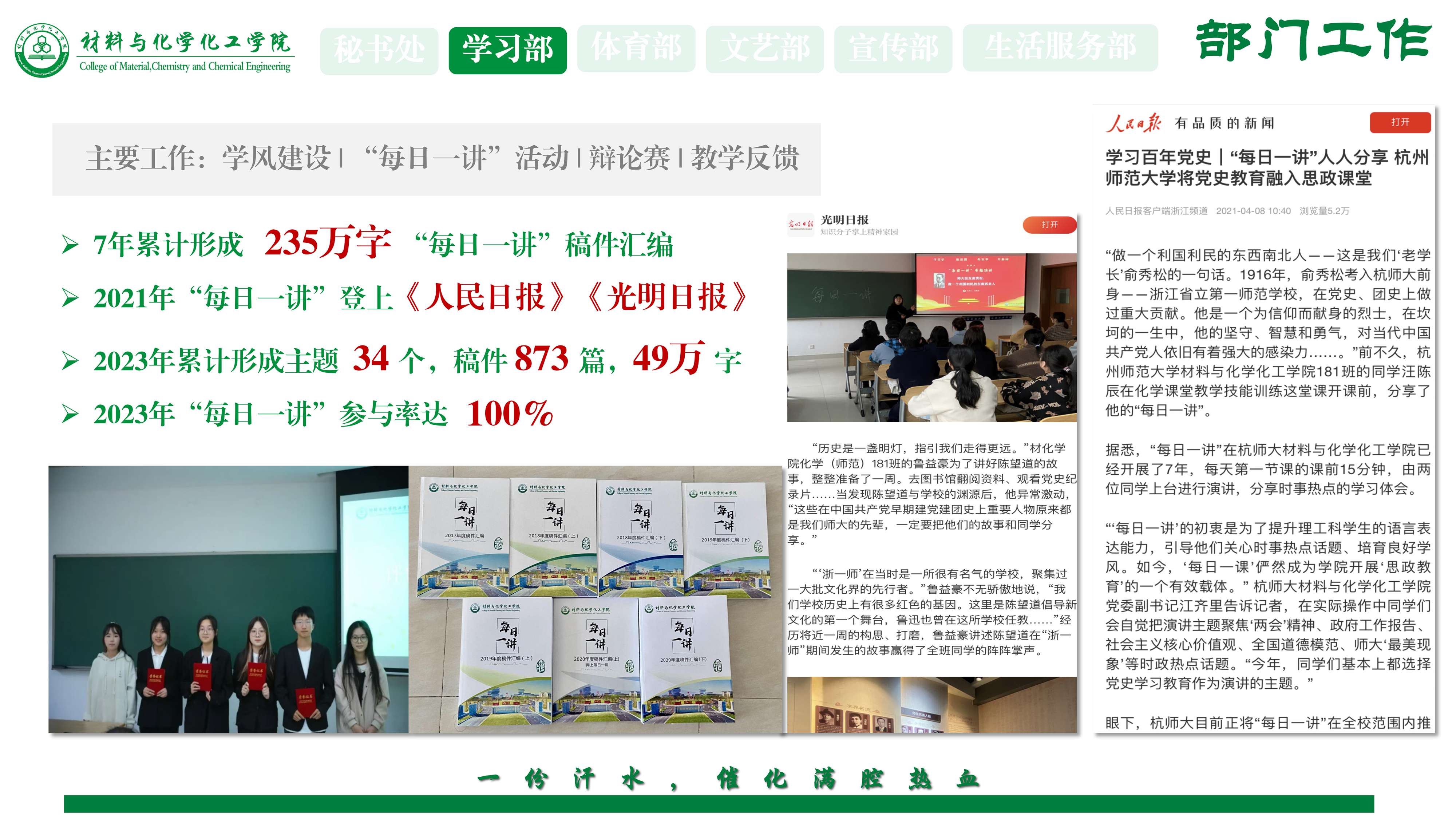 围绕学风建设,负责开展“每日一讲”活动,组织辩论赛,进行教学反馈等,引领、鼓励学生关注国家大事,传播正能量。
