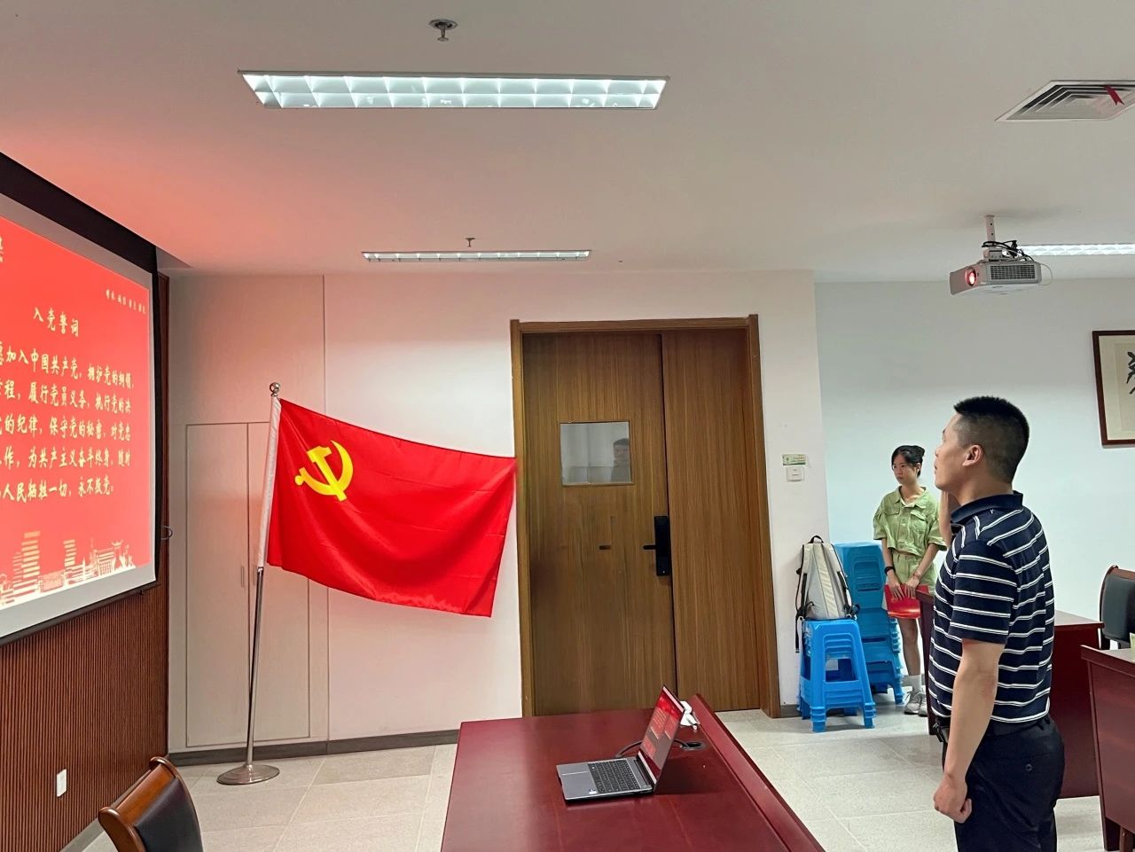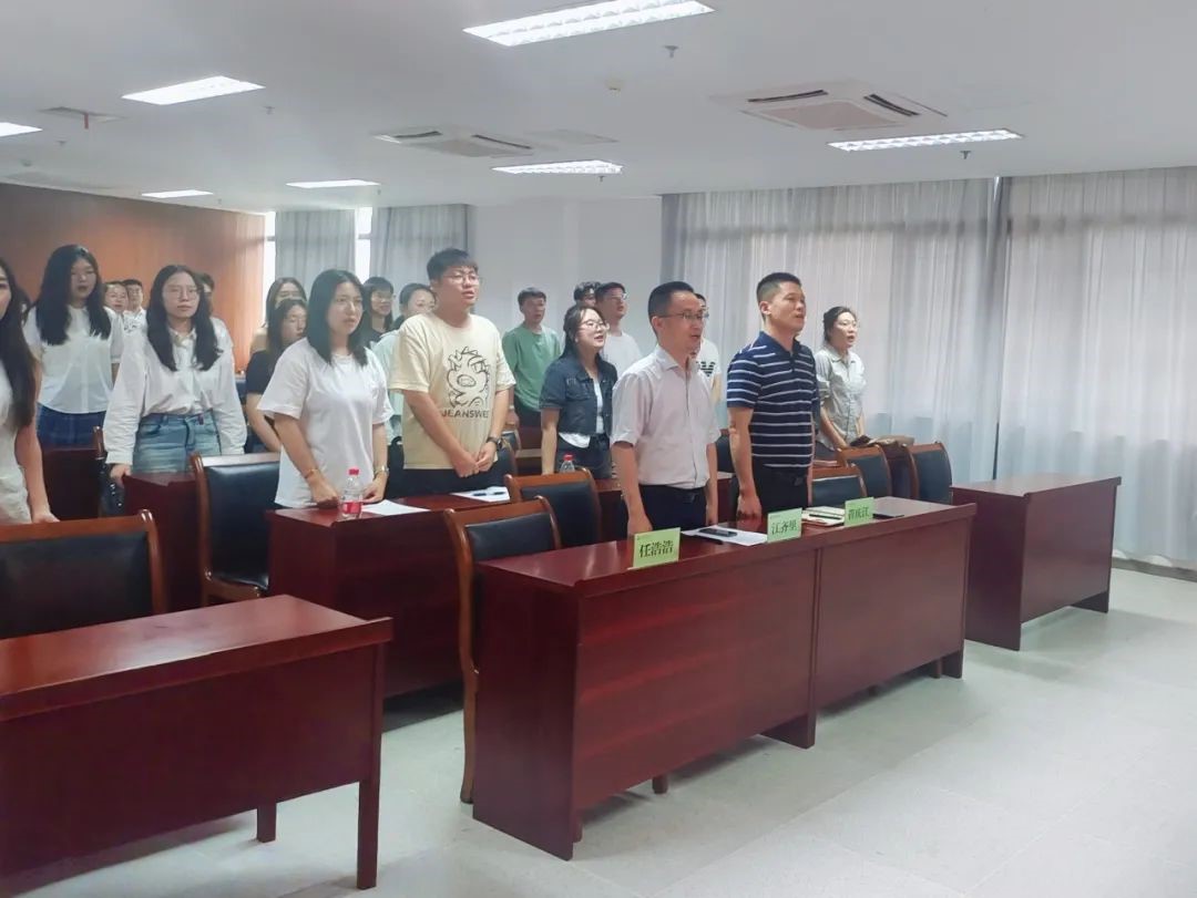 开课伊始,随着激昂的国歌旋律缓缓响起,全体师生党员肃立,目光如炬,共同高唱国歌。