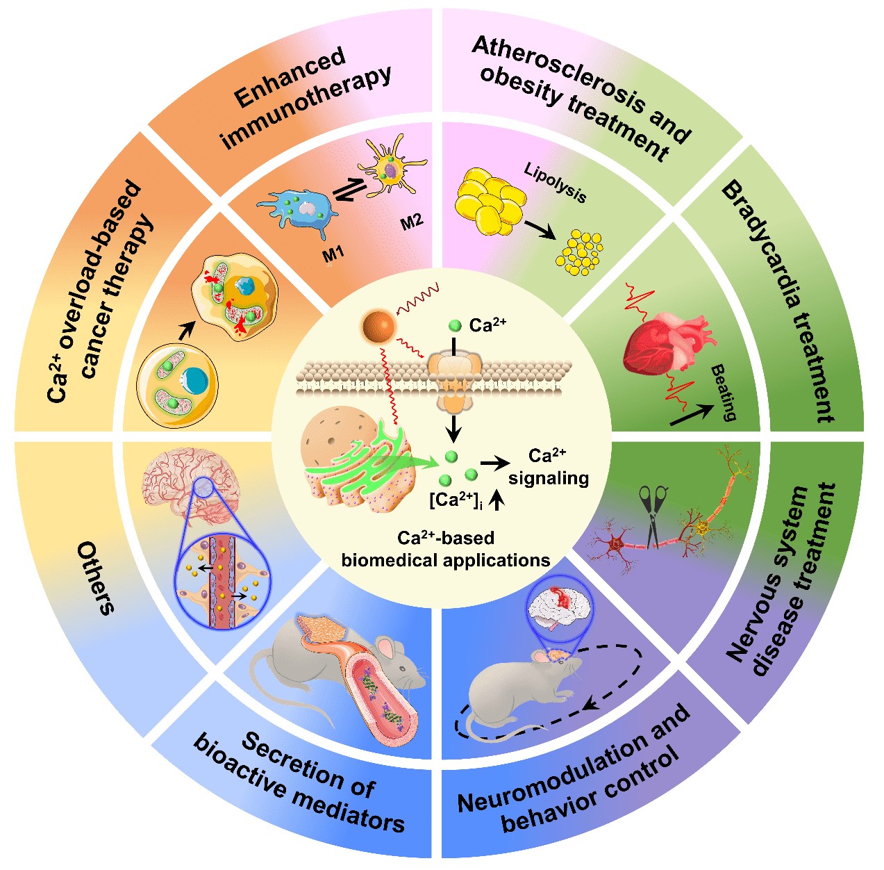 根据Ca2+信号广泛的应用潜力,作者将其细分为Ca2+过载引起的肿瘤治疗、Ca2+信号强化的免疫响应、粥状动脉硬化和肥胖治疗、心率过慢治疗、神经退行性疾病治疗、动物运动行为调控、生物活性调节剂释放等方面。在该部分,作者着重探讨了在不同细胞中Ca2+信号调控的下游效应器、激活的信号通路和产生的生物学结果,详尽地分析了技术应用的局限性与未来发展趋势。