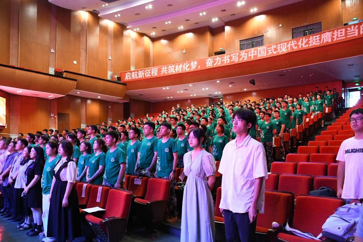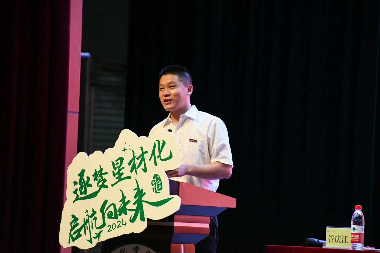 章鹏飞首先对新生加入材化学院大家庭表示热烈欢迎,是他们的到来为学院发展注入了新鲜血液。他结合国家、时代和学校发展的大背景介绍了学院筚路蓝缕的发展历程、师资队伍、学科专业、人才培养以及目前取得的成绩等等,并以“启航新征程,共筑材化梦”为题为同学们开讲“开学第一课”,提出了三点希望和要求。一要树立远大志向,厚植家国情怀,坚定不移听党话、跟党走,把个人理想融入党和国家事业之中,成就更有高度、更有境界、更有品味的人生;二要夯实知识基础,提升创新能力,学会换位思考,敢于挑战,培养勤于思考的习惯,在不断思考的学习和实践中提升个人创新能力;三要坚持刚毅中正,砥砺精神品格,珍惜四年同窗情谊,共同应对困难挫折,一路相伴,成长成才,在每一次困难和挑战中磨练自己的志气、骨气、底气。他鼓励同学们珍惜大学时光,传承学院精神,成为具有家国情怀、扎实知识、创新能力和坚韧品格的新时代好青年。