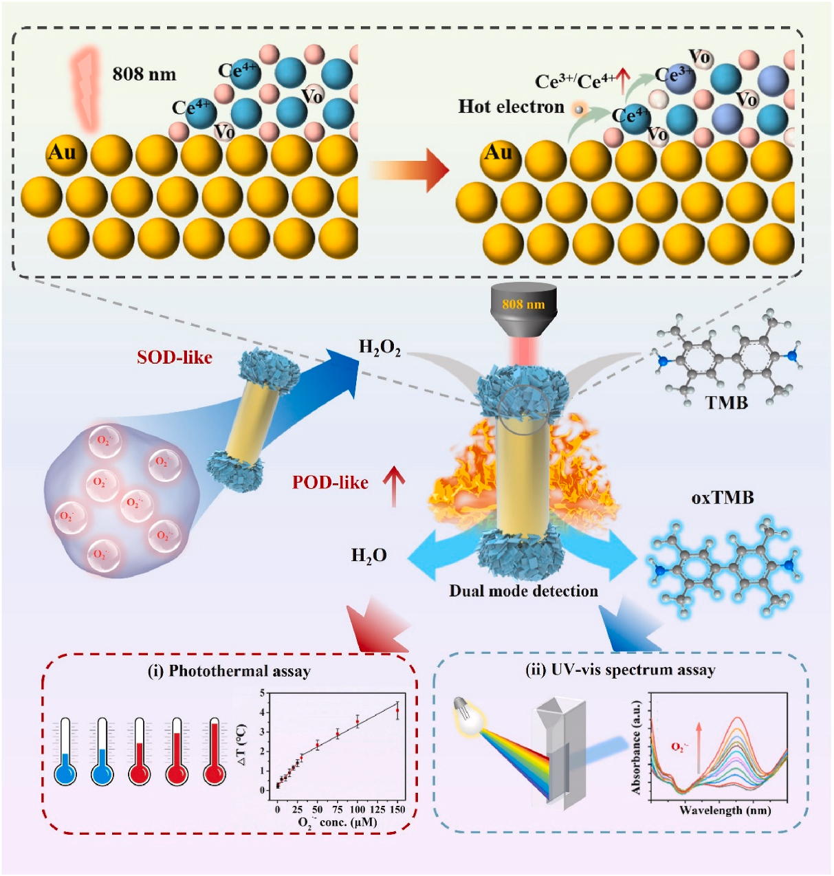 本研究成功合成了具有空间分离异质结构的哑铃型Au-CeO2金属半导体纳米酶。在中性环境下,由于Au-CeO2具有类似超氧化物歧化酶的活性,低浓度、短寿命的O2·−可以转化为长寿命的H2O2。更重要的是,Au-CeO2通过等离子体诱导的热电子和光热效应,以其显著的类过氧化物酶活性实现超灵敏的H2O2响应,并通过双模式检测平台,即光热效应引起的温度变化和3,3',5,5'-四甲基联苯胺氧化引起的吸光度变化来确定。综上所述,本工作不仅为等离子体诱导光热增强纳米酶活性提供了参考,而且为O2·−检测提供了一种低成本、高灵敏度的方法。