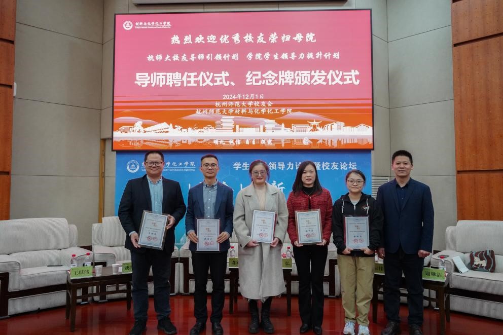 论坛伊始,管庆江分别为杭州之江有机硅化工有限公司、杭州之江新材料有限公司销售总监王琪伟(时任学院第一届团委学生会主席),萧山区第十高级中学高二年级部主任、教务处副主任戴海江(时任学院第一届团委学生会副主席)杭州市钱塘区学正中学“最美教师”张弘(时任学院第一届团委学生会副主席),杭州市钱塘区观澜中学副校长漏伟君(时任学院第一届团委学生会秘书长)), 亚洲色吧 党委统战部办公室主任谢琳洁(时任学院第一届团委学生会团委副书记)颁发“ 亚洲色吧 校友导师引领计划”暨“材化学院学生领导力素养提升计划”导师聘书以及“导师思享会”纪念牌。