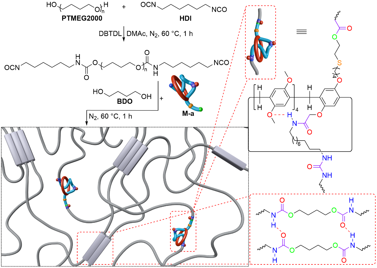 基于此,李世军教授团队通过合理的分子设计,制备了一种同时含有羟基与氨基的柱[5]芳烃,该柱[5]芳烃可以通过分子内氢键自发形成准[1]轮烷(图1)。该准[1]轮烷具有可释放的烷基链。再将它引入到聚合物主链上,构筑了基于具有弹簧状结构的柱芳烃准[1]轮烷的聚氨酯弹性体(图2)。