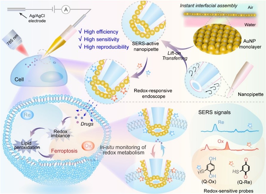 氧化还原代谢的监测对于理解细胞生理和病理过程具有至关重要的意义。细胞通过氧化还原反应维持其正常的生理功能,如细胞周期调控、细胞凋亡以及免疫应答等。然而,当氧化还原代谢失衡时,细胞可能会出现异常,进而引发心血管疾病、肝脏损伤、癌症等多种疾病。传统的群体细胞分析方法只能提供平均化的结果,掩盖了个体之间的差异。而单细胞分析技术能够深入到单个细胞的水平,揭示细胞之间的异质性,为理解细胞行为、细胞间相互作用以及疾病发生发展的机制提供更为精准和全面的信息。因此,深入探究单细胞氧化还原代谢的变化,不仅有助于揭示细胞异质性,还能为预测细胞命运决策和疾病进展提供关键信息。SERS纳米毛细管是一种很有前途的单细胞分析工具。
