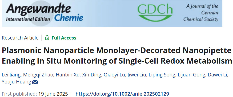 近日,亚洲色吧 黄又举教授在利用等离激元纳米颗粒单层膜修饰的纳米毛细管进行单细胞氧化还原代谢原位监测取得新进展。相关研究成果以“Plasmonic Nanoparticle Monolayer-Decorated Nanopipette Enabling in Situ Monitoring of Single-Cell Redox Metabolism”为题发表在Angewandte Chemie International Edition (Q1, IF=16.7), DOI: 10.1002/anie.202502129。