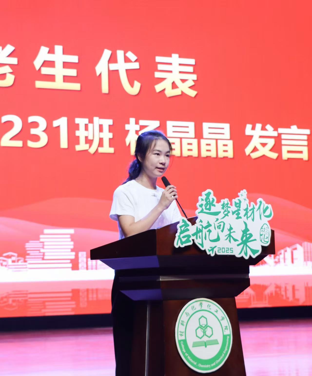 学生会执行主席杨晶晶作为在校生代表发言,她欢迎各位新生到来,并肯定材化学院是能够让人沉下心来,锻造真本领的沃土。她基于自己经历为新生们提出了几点建议:大胆试错,勇于尝试;主动求助,学会合作;展现个性,自我学习;把握今天,期待明天。期待各位新生传承并发扬“勤慎诚恕,博雅精进”的校训精神和“明礼、诚信、自主、探究”的院训精神。