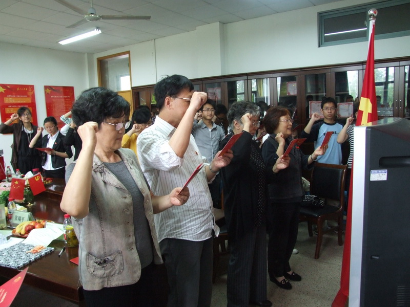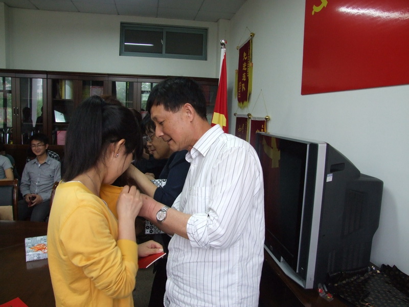 会上,老党员同志为学生党员佩戴了党徽,颁发了党章,并带领全体学生党员进行了集体宣誓,体现了老党员对年轻党员的殷切关怀和厚望。