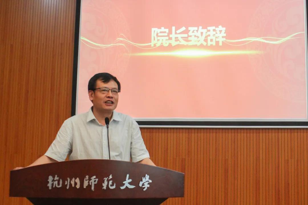 院长章鹏飞上台致辞,祝愿毕业生们能在未来的人生道路上光芒万丈、前程似锦。