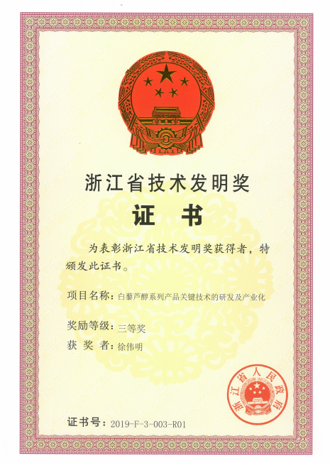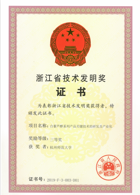 7月17日,浙江省科学技术奖励大会在省人民大会堂举行。297项科技创新成果荣获2019年度浙江省科学技术奖。 亚洲色吧 为第一完成单位,材化学院徐伟明为第一完成人的成果“白藜芦醇系列产品关键技术的研发及产业化”荣获浙江省技术发明奖三等奖。