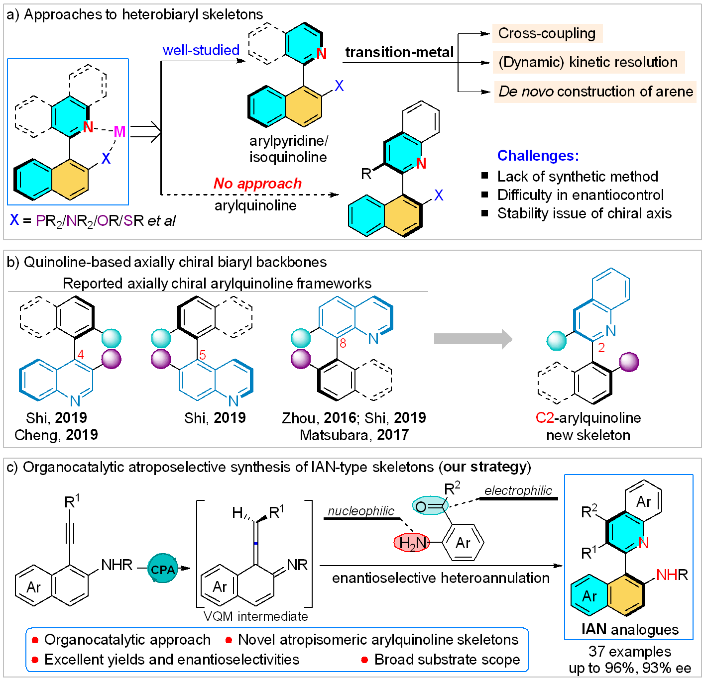 众所周知,2-芳基吡啶(异喹啉)类轴手性骨架是众多优势手性催化剂和配体的核心结构单元, 然而其高对映选择性构建却面临着许多挑战。例如,已见报道的合成方法主要依赖于过渡金属的参与,而基于有机催化的合成策略却尚未实现;其次,目前该类轴手性骨架中含氮芳杂环大多局限于吡啶、异喹啉结构,而对于含喹啉等其他杂环的类似轴手性骨架的报道却极少。因此,为了不断探索新型的潜在优势轴手性骨架,亚洲色吧 钟国富教授团队与南方科技大学的谭斌教授合作,设计了一类新型的2-芳基喹啉轴手性骨架,并首次提出通过有机催化策略,利用手性磷酸(CPA)催化下芳基炔烃类化合物与邻氨基氟代苯乙酮的不对称串联环化反应来实现目标IAN类轴手性骨架的不对称构建。该方法具有良好的底物适用性,在温和条件下以优秀的收率和对映选择性快速高效地合成了一系列新型2-芳基喹啉轴手性化合物。同时,通过克级放大实验以及一系列的衍生化反应,体现出该研究具有进行大规模制备以及在开发新型手性催化剂和配体方面广阔的应用前景。该工作是首例通过有机催化策略不对称合成IAN类轴手性化合物的报道,为相关轴手性骨架化合物的高效构建提供了一种全新策略。